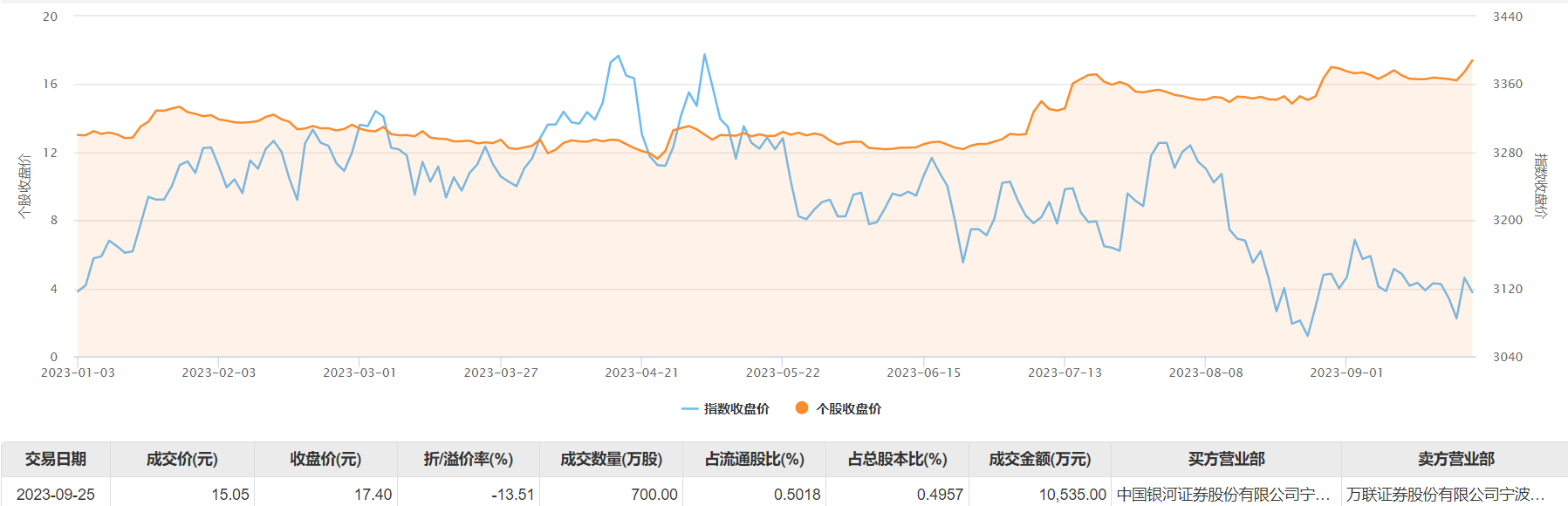 9月25日大宗交易成交700万股,成交额1.05亿元,占当日总成交额的31.08%,成交价15.05元,较市场收盘价17.4元折价13.51%。