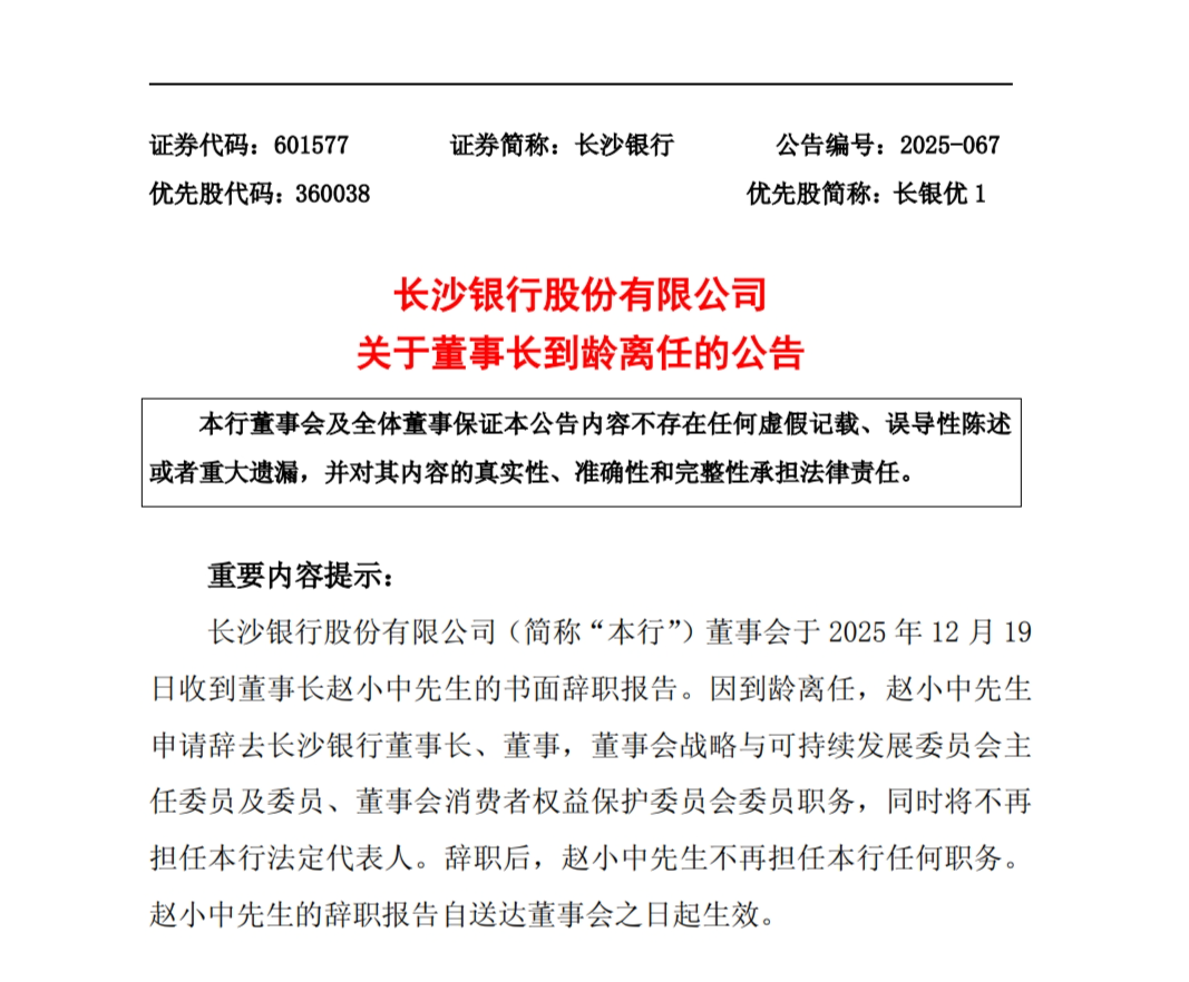 12月20日,长沙银行发布公告,公司董事会于2025年12月19日收到董事长赵小中的书面辞职报告。因到龄离任,赵小中申请辞去长沙银行董事长、董事,董事会战略与可持续发展委员会主任委员及委员、董事会消费者权益保护委员会委员职务,同时将不再担任本行法定代表人。辞职后,赵小中不再担任本行任何职务。赵小中的辞职报告自送达董事会之日起生效。