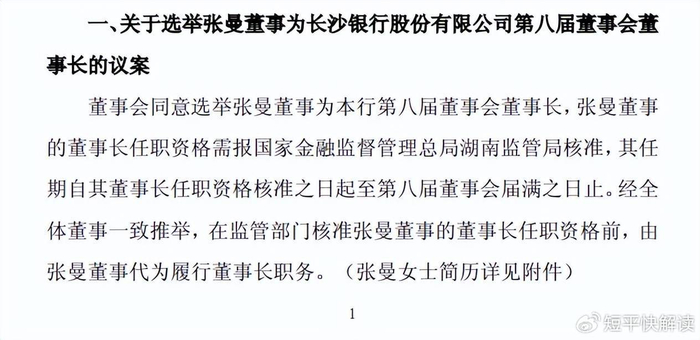张曼晋升为董事长。同日,长沙银行董事会确定董事长接任人选,选举张曼为第八届董事会董事长,任职资格尚需国家金融监督管理总局湖南监管局核准,在此期间代为履行董事长职务。