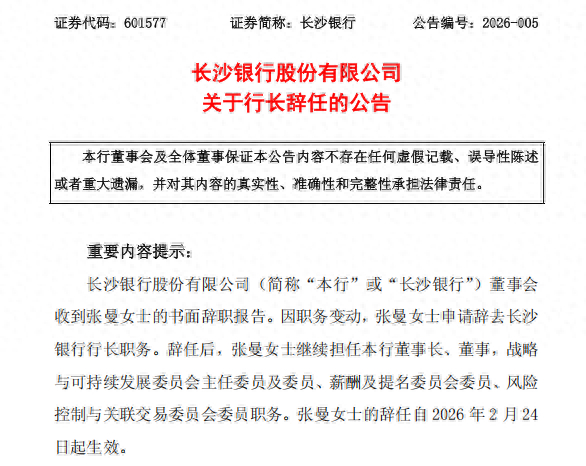 红网时刻新闻2月25日讯(记者 肖娟)长沙银行将聘新行长!2026年2月25日晚,长沙银行发布公告称,董事会收到张曼的书面辞职报告,因职务变动,张曼申请辞去长沙银行行长职务。张曼的辞任自2026年2月24日起生效。
