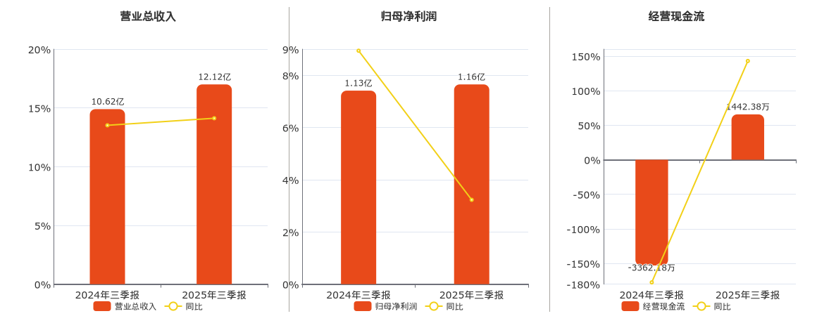 公司营业总收入为12.12亿元,在已披露的同业公司中排名第6。归母净利润为1.16亿元,在已披露的同业公司中排名第8。经营活动现金净流入为1442.38万元,在已披露的同业公司中排名第8。