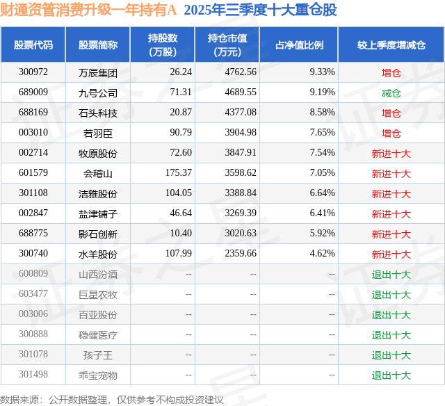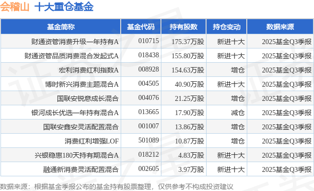 根据2025基金Q3季报公募基金重仓股数据,重仓该股的公募基金共10家,其中持有数量最多的公募基金为财通资管的财通资管消费升级一年持有A。财通资管消费升级一年持有A目前规模为4.84亿元,最新净值0.8341(11月7日),较上一交易日下跌0.3%,近一年上涨12.87%。该公募基金现任基金经理为于洋 林伟。于洋在任的基金产品包括:财通资管消费精选混合A,管理时间为2018年9月14日至今,期间收益率为145.85%;林伟在任的基金产品包括:财通资管品质消费混合发起式A,管理时间为2023年5月11日至今,期间收益率为31.9%;