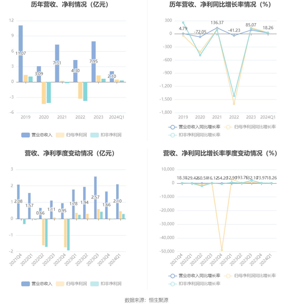 2024年第一季度,公司经营活动现金流净额为-184.16万元,同比增加2280.55万元;筹资活动现金流净额-2633.72万元,同比减少2576.15万元;投资活动现金流净额-3.00亿元,上年同期为-2.76亿元。