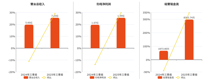 公司营业总收入为7.23亿元,较去年同报告期营业总收入增加1.63亿元,同比较去年同期上涨29.09%。归母净利润为1.39亿元,在已披露的同业公司中排名第6,较去年同报告期归母净利润增加3201.46万元,同比较去年同期上涨29.81%。经营活动现金净流入为8383.74万元,较去年同报告期经营活动现金净流入增加6509.94万元,同比较去年同期上涨347.42%。