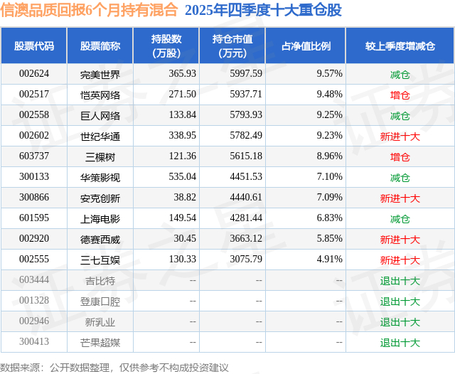 信澳品质回报6个月持有混合的前十大重仓股如下: