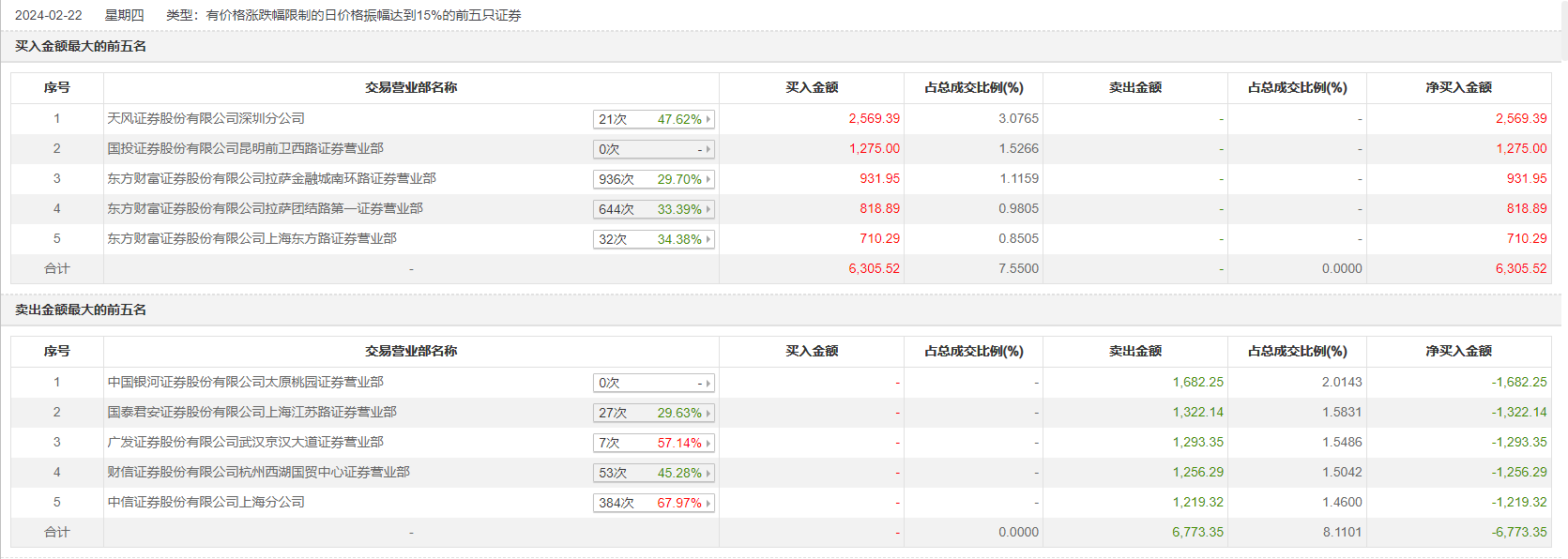具体来看,知名游资现身龙虎榜,天风证券深圳分公司、国投证券昆明前卫西路证券营业部分别买入2569.39万元、1275.00万元;中国银河证券太原桃园证券营业部、章盟主(国泰君安证券上海江苏路证券营业部)分别卖出1682.25万元、1322.14万元。