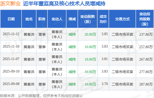 浙文影业:11月12日高管黄春洪减持股份合计20万股