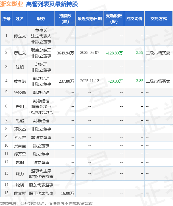 浙文影业的高管列表及最新持股情况如下: