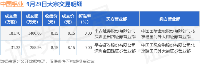 证券之星消息,9月29日中国铝业发生大宗交易,交易数据如下: