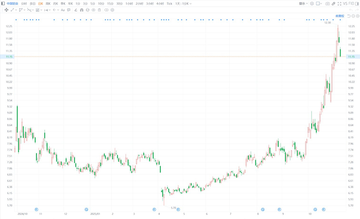 中国铝业(601600.SH)现跌4.46%报11.14元,暂成交52亿元,最新市值1911亿元。该股上周四(11月13日)盘中曾高见12.3元,股价创2010年11月12日以来逾15年新高。
