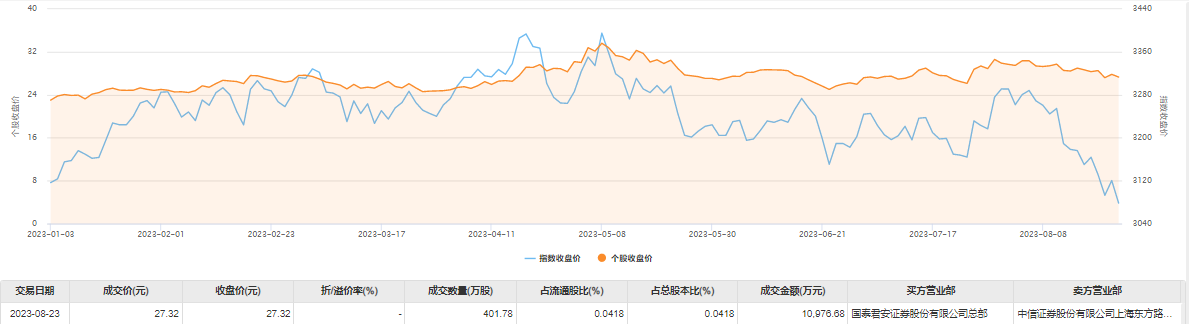 8月23日大宗交易成交401.78万股,成交额1.1亿元,占当日总成交额的20.66%,成交价27.32元,较市场收盘价27.32元持平。