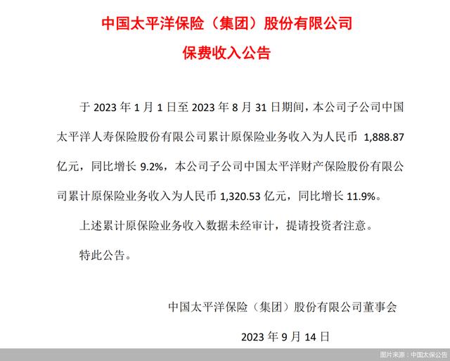 北京商报讯(记者 陈婷婷 李秀梅)9月13日,中国太平洋保险(集团)股份有限公司(以下简称“中国太保”)公告,于2023年1月1日至2023年8月31日期间,公司子公司中国太平洋人寿保险股份有限公司累计原保险业务收入为1888.87亿元,同比增长9.2%,公司子公司中国太平洋财产保险股份有限公司累计原保险业务收入为1320.53亿元,同比增长11.9%。中国太保两家子公司前8月原保险保费收入合计为3209.4亿元。