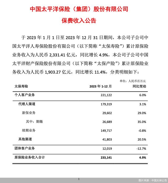 北京商报讯(记者 胡永新)1月16日,中国太平洋保险(集团)股份有限公司(以下简称“中国太保”)发布保费收入公告显示,2023年1月1日至2023年12月31日期间,公司子公司中国太平洋人寿保险股份有限公司累计原保险业务收入为2331.41亿元,同比增长4.9%,公司子公司中国太平洋财产保险股份有限公司累计原保险业务收入为1903.27亿元,同比增长11.4%。中国太保上述两家子公司合计保险业务收入为4234.68亿元,同比增长7.7%。