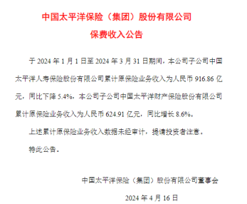 4月15日,中国太保发布保费收入公告。公告显示,一季度,中国太保公司子公司中国太平洋人寿保险股份有限公司累计原保险业务收入为人民币916.86亿元,同比下降5.4%;子公司中国太平洋财产保险股份有限公司累计原保险业务收入为人民币624.91亿元,同比增长8.6%。