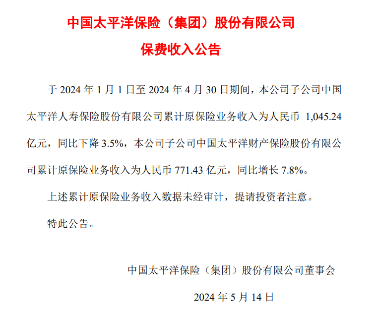 5月13日,中国太保发布保费收入公告,2024年1月1日至2024年4月30日期间,子公司中国太平洋人寿保险股份有限公司累计原保险业务收入为人民币1045.24亿元,同比下降3.5%,子公司中国太平洋财产保险股份有限公司累计原保险业务收入为人民币771.43亿元,同比增长7.8%。两家子公司前4月原保险业务收入合计为1816.67亿元,较2023年同期的1798.86亿元增长1%。