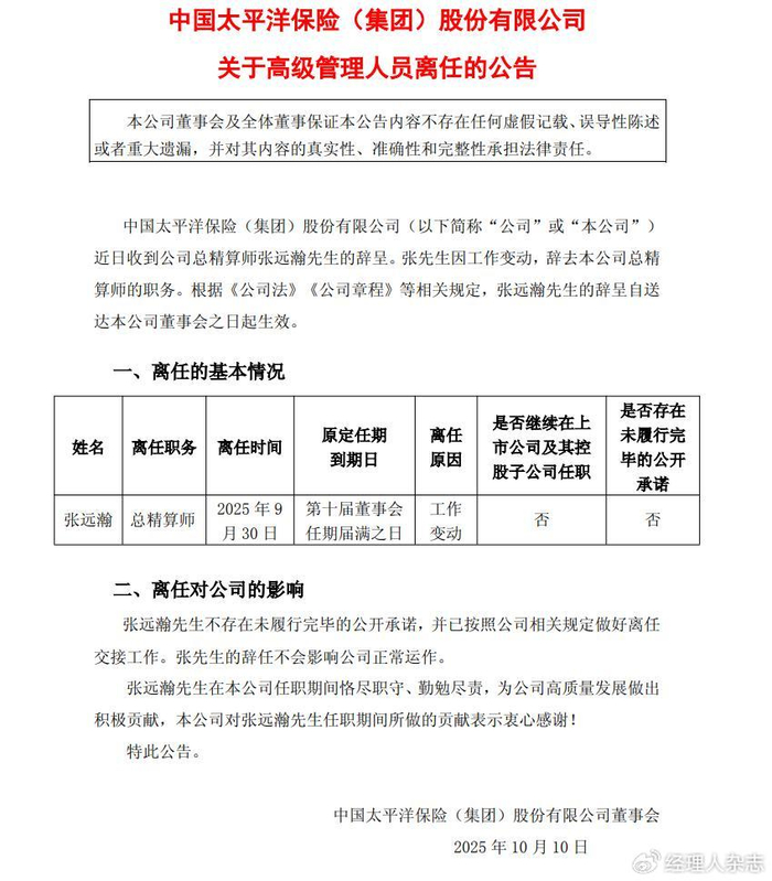 10月10日,中国太保(02601.HK,601601.SH)公告显示,公司近日收到总精算师张远瀚先生的辞呈。张先生因工作变动,辞去本公司总精算师的职务。