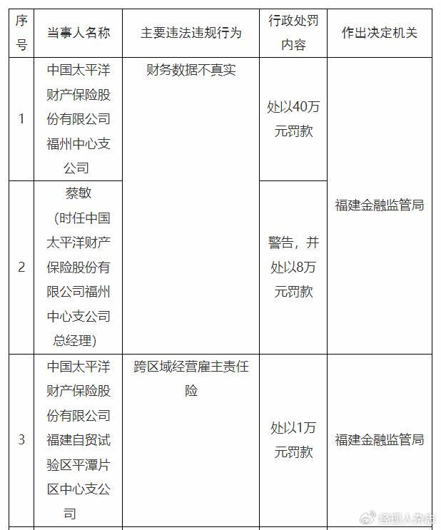 同月9日,福建监管局的行政处罚直指太保产险。信息显示,太保产险福州中心支公司,因财务数据不真实,被处以40万元罚款。同时,时任该公司总经理的蔡敏,被予以警告并处以8万元罚款;