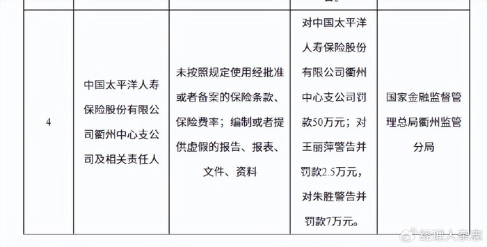 9月,监管局均对太保寿险及太保产险的分支机构作出了行政处罚。当月19日,太保寿险衢州中心支公司因未依规使用经批准或备案的保险条款与保险费率,还编制并提供虚假的报告、报表、文件以及资料,被罚款50万元。同时,对王丽萍警告并罚款2.5万元,对朱胜警告并罚款7万元。