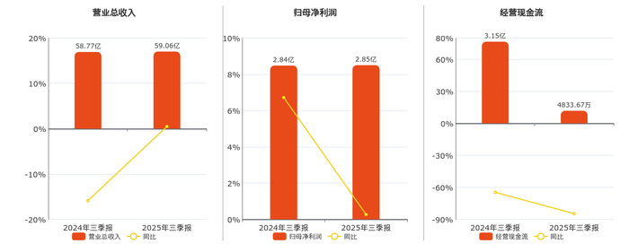 公司营业总收入为59.06亿元,在已披露的同业公司中排名第9,较去年同报告期营业总收入增加2868.11万元,同比较去年同期上涨0.49%。归母净利润为2.85亿元,在已披露的同业公司中排名第24,较去年同报告期归母净利润增加76.22万元,实现3年连续上涨,同比较去年同期上涨0.27%。经营活动现金净流入为4833.67万元,在已披露的同业公司中排名第76。