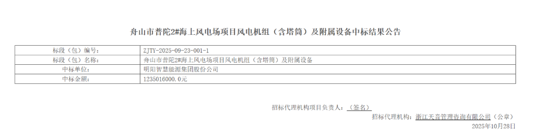 10月28日,浙能集团智能供应链一体化平台发布《舟山市普陀2#海上风电场项目风电机组(含塔筒)及附属设备中标结果公告》。