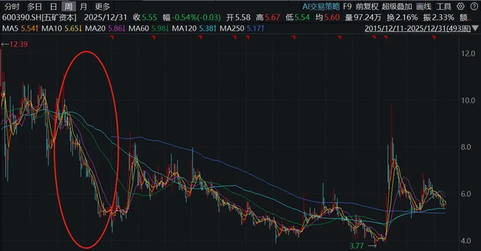 而另一边的五矿资本,在当年这个方案一经推出,也导致五矿资本股价持续走弱,直到现在,也未能再回到当年出售资产之前的位置。