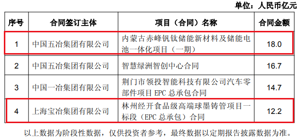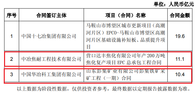 冶金领域,2026年2月,中冶焦耐工程技术有限公司签约营口达丰焦化有限公司年产200万吨焦化复产项目EPC总承包工程合同,合同额11.1亿元,中国华冶科工集团有限公司签约山东彭集矿业有限公司彭集铁矿采矿工程(一期)合同,合同额10.4亿元;2026年1月,中国五冶集团有限公司签约内蒙古赤峰钒钛储能新材料及储能电池一体化项目(一期),合同额18.0亿元,上海宝冶集团有限公司签约林州经开食品级高端球墨铸管项目一标段(EPC 总承包)合同,合同额12.2亿元。