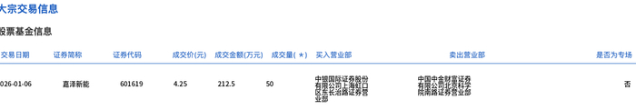 1月6日,嘉泽新能大宗交易成交50万股,成交额212.5万元,占当日总成交额的0.3%,成交价4.25元,较市场收盘价4.87元折价12.73%。