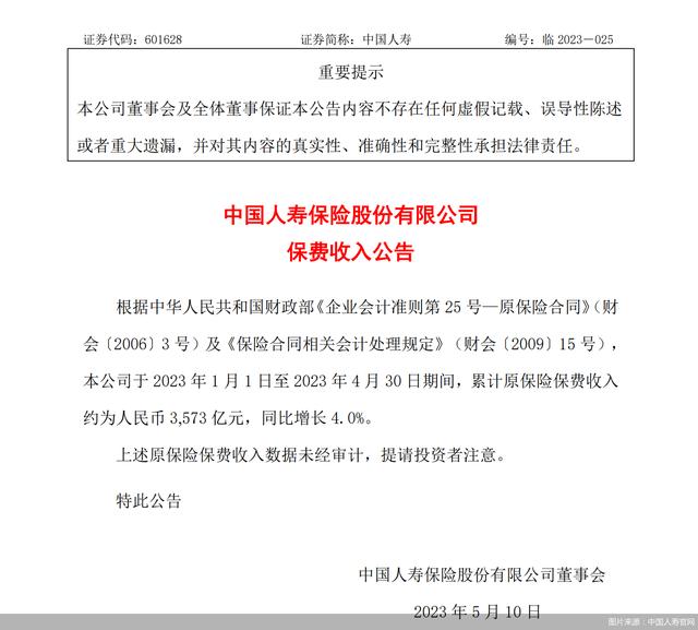 保险股份有限公司公告称,公司于2023年1月1日至2023年4月30日期间,累计原保险保费收入约为3573亿元,同比增长4.0%。