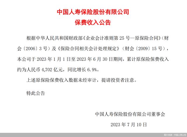北京商报讯(记者 孟凡霞 李秀梅)7月10日,中国人寿保险股份有限公司发布公告称,公司于2023年1月1日至2023年6月30日期间,累计原保险保费收入约为4702亿元,同比增长6.9%。