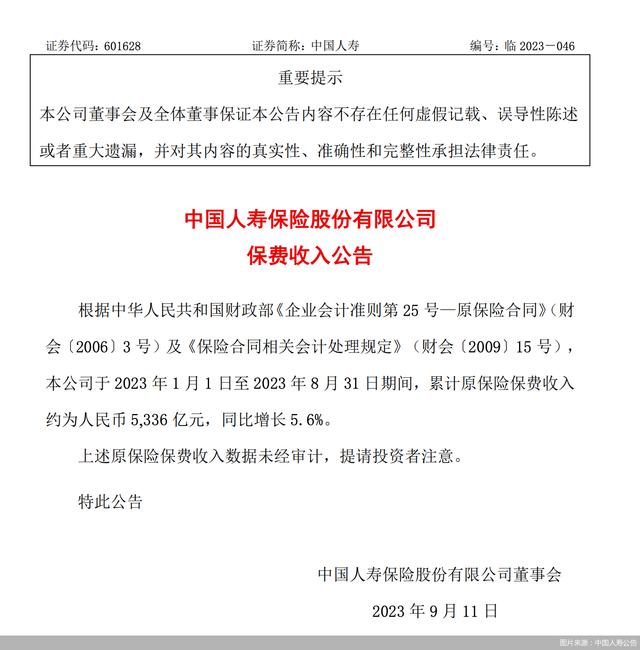 北京商报讯(记者 陈婷婷 胡永新)9月11日,中国人寿保险股份有限公司发布保费收入公告称,公司于2023年1月1日至2023年8月31日期间,累计原保险保费收入约为5336亿元,同比增长5.6%。