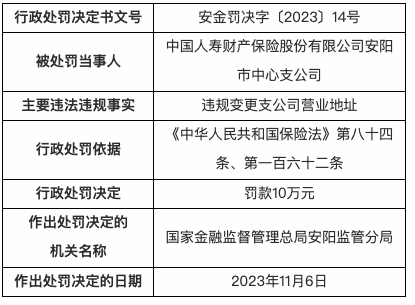11月8日,国家金融监督管理总局安阳监管分局行政处罚信息公开表显示,2023年11月6日,中国人寿财产保险股份有限公司安阳市中心支公司因违规变更支公司营业地址,被处罚款10万元。时任中国人寿财产保险股份有限公司林州市支公司经理杨向科对中国人寿财产保险股份有限公司安阳市中心支公司违规变更支公司营业地址的违法违规行为负有责任,受到警告并处罚款3万元。
