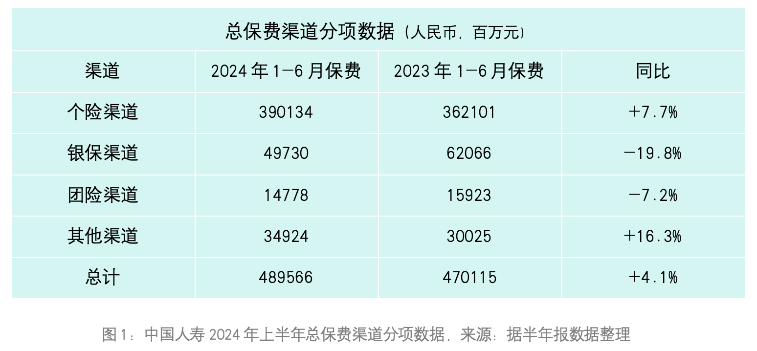具体而言,个险渠道总保费为3901.34亿元,同比增长7.7%。其中,续期保费为2958.51亿元,同比增长8.6%;个险渠道上半年新业务价值为292.91亿元,同比上升14.6%。