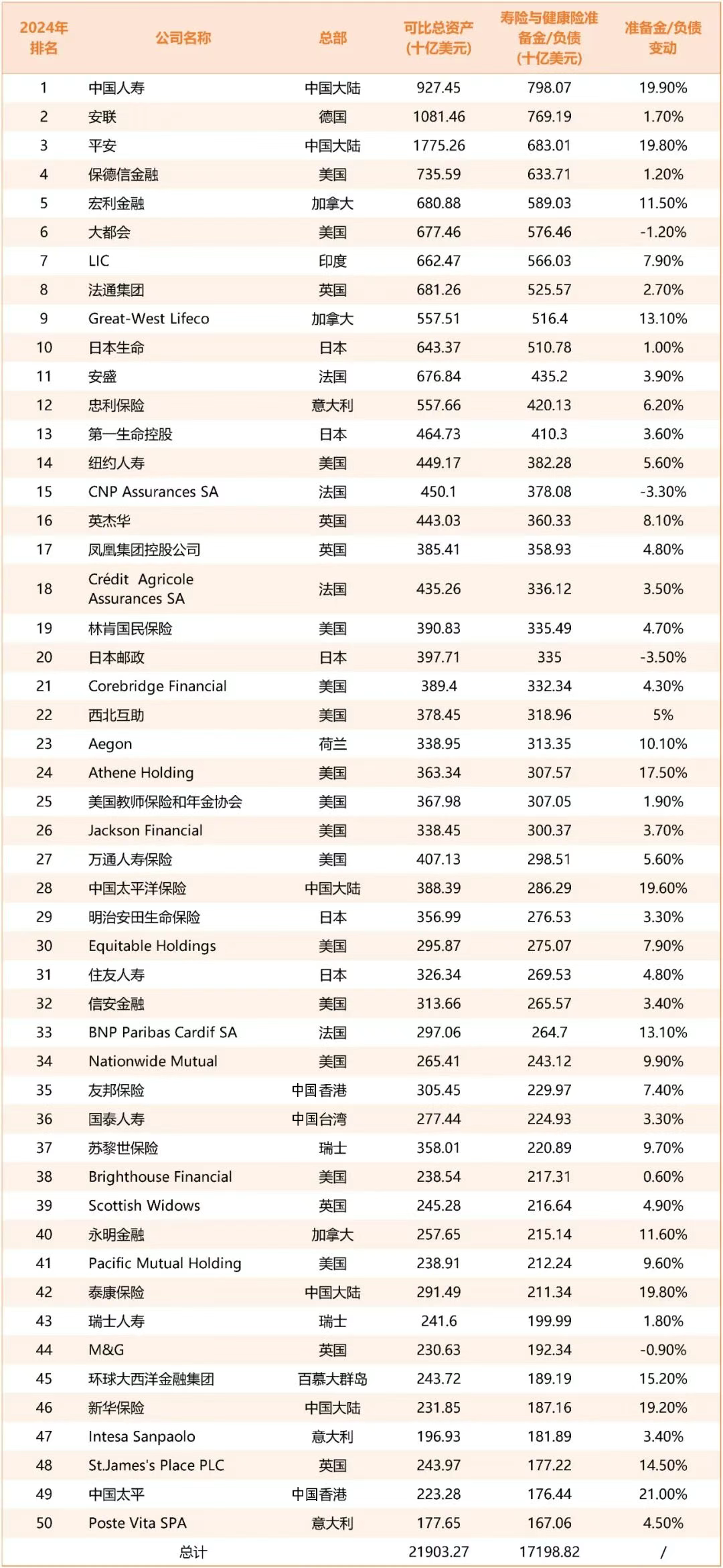 该榜单以寿险和健康险准备金为排名核心指标,更直观反映寿险公司的长期责任规模与风险承担能力。中国公司凭借国内市场优势和业务增长,集体进入前列,展现了中国保险行业的快速发展。