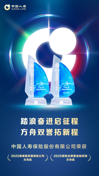 寿险行业头雁——中国人寿保险股份有限公司(以下简称“中国人寿”,股票代码:601628.SH,2628.HK)凭借在高质量发展领域的卓越表现与普惠金融的特色实践,一举斩获“2025高质量发展保险公司方舟奖”和“2025保险业普惠金融实践方舟奖”两项重磅荣誉。