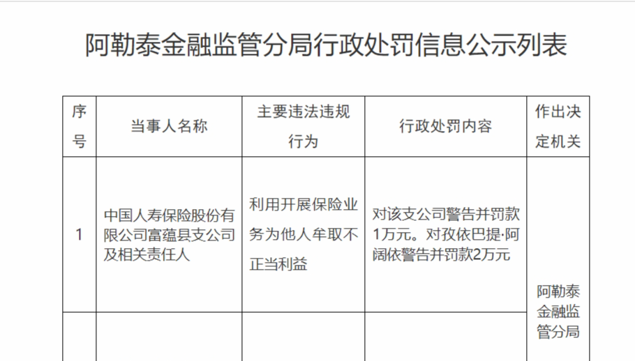 12月19日,阿勒泰金融监管分局行政处罚信息公示列表显示,中国人寿保险股份有限公司富蕴县支公司,利用开展保险业务为他人牟取不正当利益,被警告并罚款1万元;责任人孜依巴提·阿阔依被警告并罚款2万元。