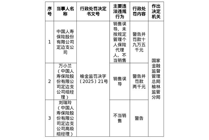 罚单显示,中国人寿保险股份有限公司定边支公司的主要违法违规行为包括:销售误导、未按规定管理个人保险代理人、不当销售。