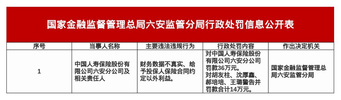 罚单显示,中国人寿保险股份有限公司六安分公司的主要违法违规事实包括:财务数据不真实、给予投保人保险合同约定以外利益。