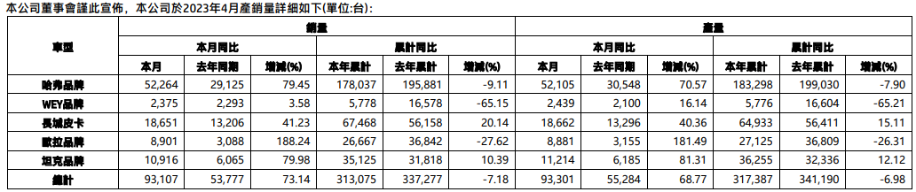 5月8日在港交所公告,4月总销量为93107台,同比增长73.14%;本年累计销量31.3075万台,同比下降7.18%。新能源车4月销售14863台,1-4月累计销售42671台。
