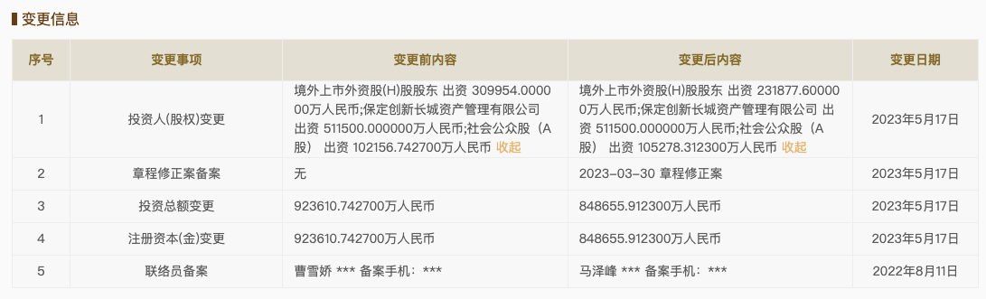 股份有限公司发生工商变更,注册资本由约92.36亿人民币减至约84.87亿人民币。该公司成立于2001年6月,法定代表人、董事长为魏建军。