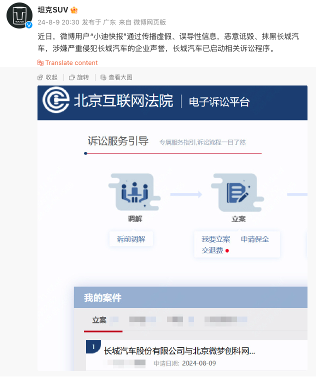 旗下坦克品牌官微发布声明称,“近日,微博用户‘小迪快报’通过传播虚假、误导性信息,恶意诋毁、抹黑长城汽车,涉嫌严重侵犯长城汽车的企业声誉,长城汽车已启动相关诉讼程序。”