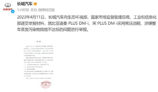最早可以追溯到去年5月,长城汽车实名公开举报比亚迪秦PLUS DM-i、宋PLUS DM-i采用常压油箱,涉嫌整车蒸发污染物排放不达标。