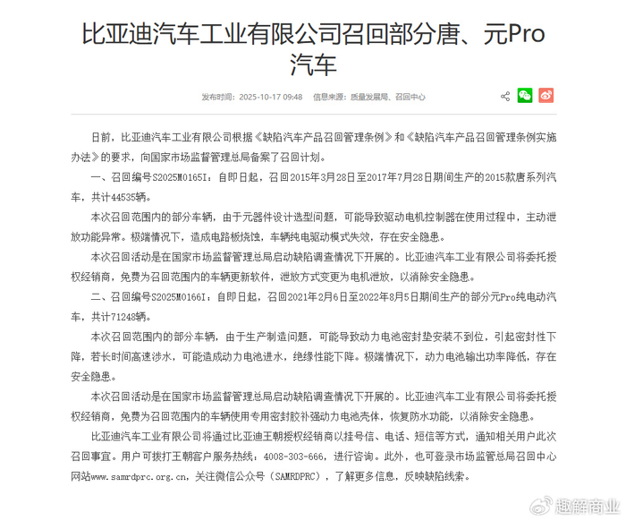 10月17日,比亚迪向国家市场监督管理总局备案了召回计划,共计115783辆。