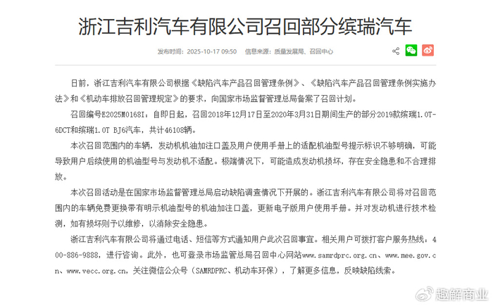 10月17日,吉利汽车根据《缺陷汽车产品召回管理条例》、《缺陷汽车产品召回管理条例实施办法》和《机动车排放召回管理规定》的要求,向国家市场监督管理总局备案了召回计划。自即日起,召回2018年12月17日至2020年3月31日期间生产的部分2019款缤瑞1.0T-6DCT和缤瑞1.0T BJ6汽车,共计46108辆。本次召回范围内的车辆,发动机机油加注口盖及用户使用手册上的适配机油型号提示标识不够明确,可能导致用户后续使用的机油型号与发动机不适配。极端情况下,可能造成发动机损坏,存在安全隐患和不合理排放。