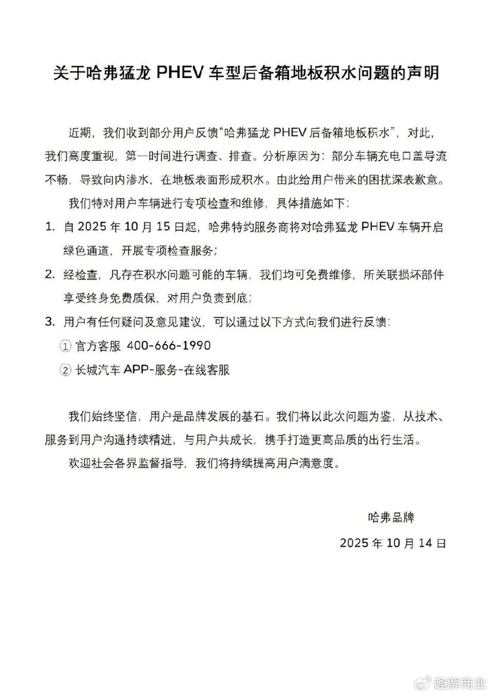 值得一提的是,10月14日,长城汽车旗下哈弗品牌就猛龙PHEV车型后备箱地板积水问题发布公开道歉声明,引发市场关注。声明指出,部分车辆因充电口盖导流不畅导致渗水,公司自10月15日起为受影响车主提供免费检查与维修,相关损坏部件享受终身质保。然而,声明未提及赔偿方案,引发消费者对安全隐患和车辆贬值的担忧。