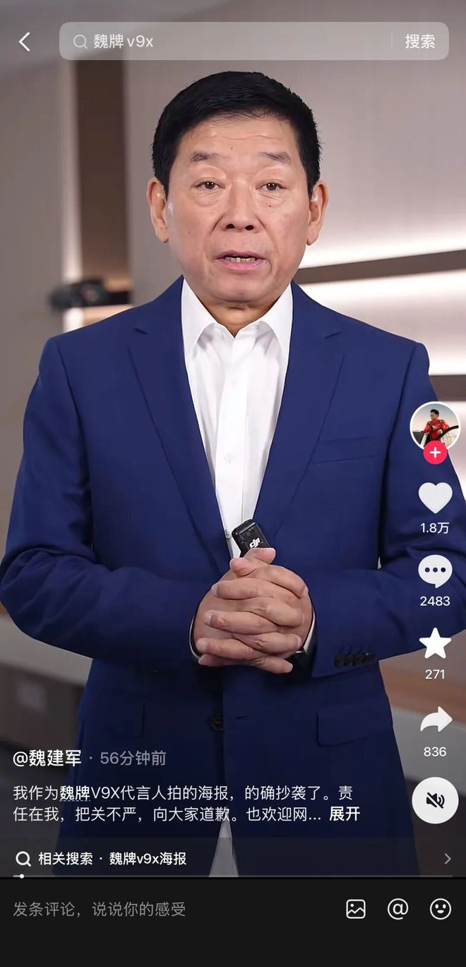 3月5日,魏牌官宣魏建军出任新车V9X代言人。随后,有业内创作者指出该海报在背景色调、构图、人物姿势及车辆摆放上,与其一年前为路虎揽胜运动版(揽运)设计的创意高度雷同,并公开喊话索要创意费。