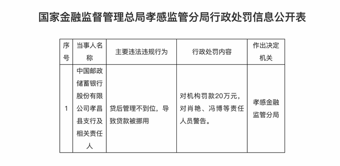 邮储银行孝昌县支行因贷后管理不到位被罚20万元