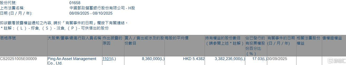 格隆汇10月8日丨根据联交所最新权益披露资料显示,2025年9月30日,邮储银行(01658.HK)获Ping An Asset Management Co., Ltd.在场内以每股均价5.4382港元增持836万股,涉资约4546.34万港元。