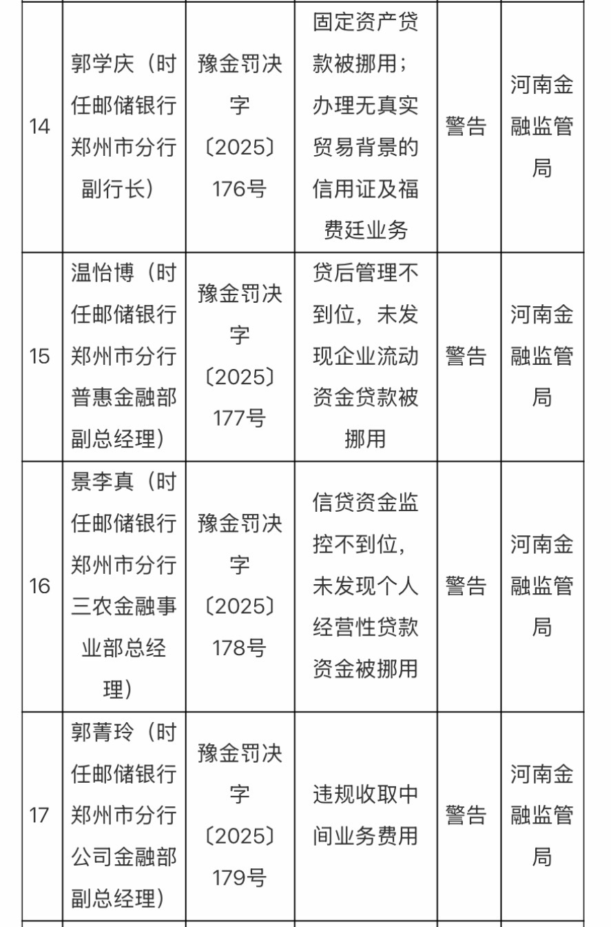 因固定资产贷款被挪用;贷后管理不到位,未发现企业流动资金贷款被挪用;信贷资金监控不到位,未发现个人经营性贷款资金被挪用;办理无真实贸易背景的信用证及福费廷业务;违规收取中间业务费用等,邮储银行郑州市分行被罚款160万元,郭学庆(时任邮储银行郑州市分行副行长)、温怡博(时任邮储银行郑州市分行普惠金融部副总经理)、景李真(时任邮储银行郑州市分行三农金融事业部总经理)、郭菁玲(时任邮储银行郑州市分行公司金融部副总经理)4人被警告。