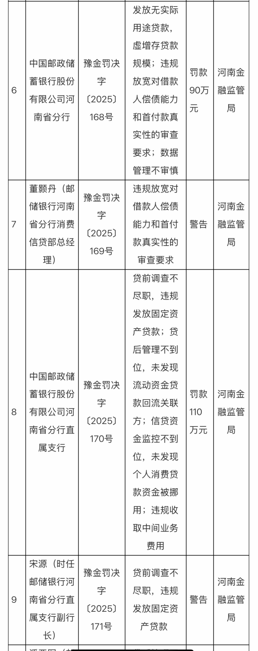 1月9日,国家金融监督管理总局河南监管局发布的行政处罚信息显示,因发放无实际用途贷款,虚增存贷款规模;违规放宽对借款人偿债能力和首付款真实性的审查要求,数据管理不审慎,邮储银行(601658.SH)河南省分行被罚款90万元;因违规放宽对借款人偿债能力和首付款真实性的审查要求,董颢丹(邮储银行河南省分行消费信贷部总经理)被警告。