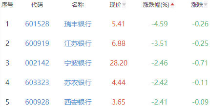瑞丰银行、江苏银行、宁波银行、苏农银行和西安银行位列涨幅榜后五位,涨幅分别为-4.59%、-3.51%、-2.46%、-2.42%和-2.41%。